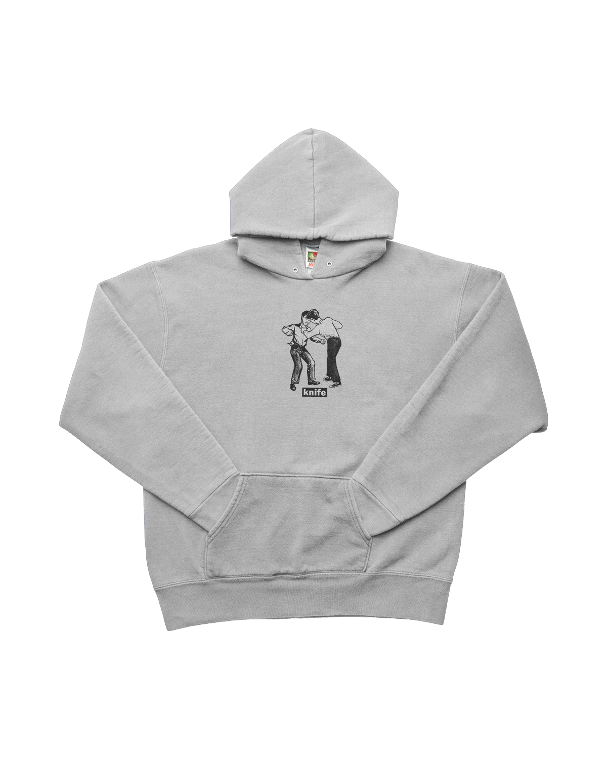 Heavyweight pullover hoodie, light heather gray. Fits true to size.